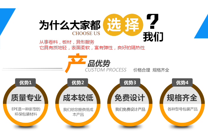 EPE是一種新型的環(huán)保包裝材料。它具有質地輕,表面柔軟,富有彈性,良好的隔熱性,優(yōu)良的緩沖,減震,防靜電性能,現已廣泛應用于家電,精密儀器儀表,醫(yī)療設備等防護包裝。